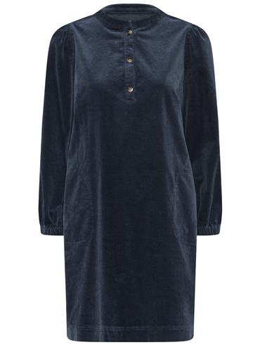 Smart fløjlskjole fra Lundgaard. Den er med stolpelukning og elastik for enden af ærmerne. Kjolen har lommer i siderne. Modellen er kort og kan f. eks styles med et par tykke strømpebukser og en lang eller kort støvle. Kjolens længde er 95 cm. i str. M