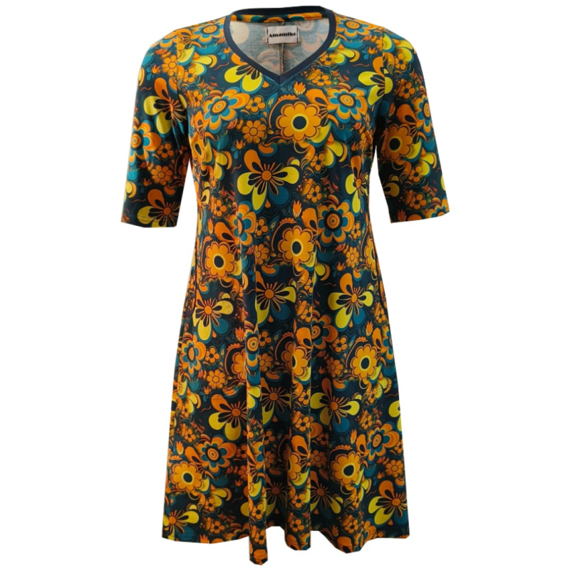 Petroleumsblå A-formet plus size kjole med retro blomsterTulla er en A-formet kjole med V-udskæringKjolen sidder til over barmen og bliver løs om mave og hofter. nbspDenne kjole er syet i oeko-tex bomuldjersey med masser af stræk, så kjolen er dejlig