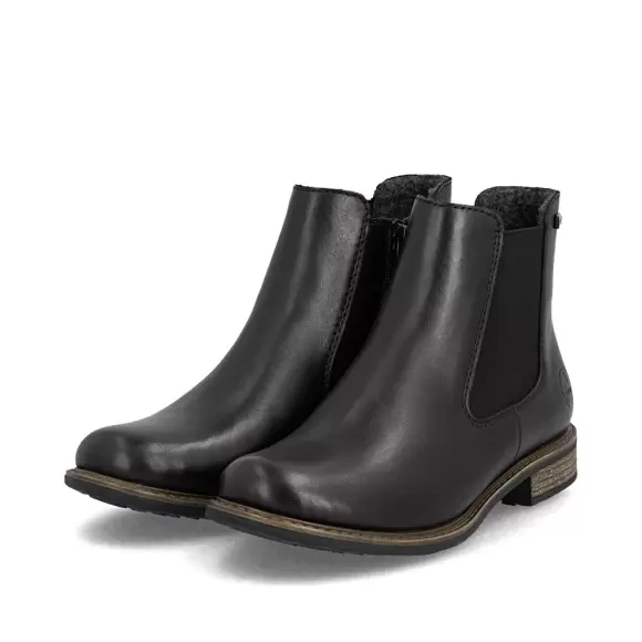 Art. No. 74870-00Rieker 74870-00 er smarte og alsidige støvler til damer, som kombinerer stilrent design med høj komfort. Den klassiske sorte overdel i glat skindlook giver et elegant udtryk, mens elastiske sider og lynlås gør dem nemme at tage af og på.