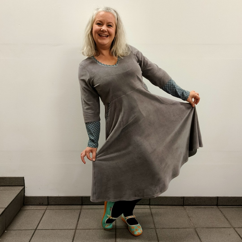 Grå plus size velour kjole med lange ærmerDana er en kjole med overskæring under barmen og v-udskæring. Kjolen sidder til over barmen og løst skørt der slutter ca. lige under knæet. nbspDenne kjole er syet i bomuldsvelour, der er åndbart og har masser