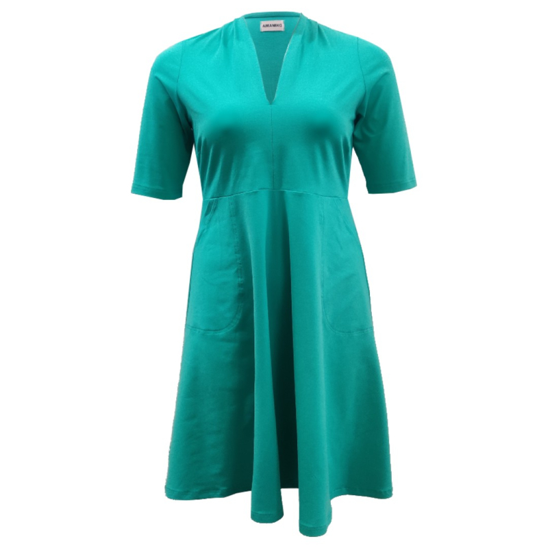 Takasaki er en kjole med overskæring under barmen og smal dyb v-udskæring. Kjolen har små læg på skulderen som gør at kjolen former sig smukt ned over brystet og a-formet skørt med masser af viddeDenne kjole er syet i mint oeko-tex jerseynbspKjolen har