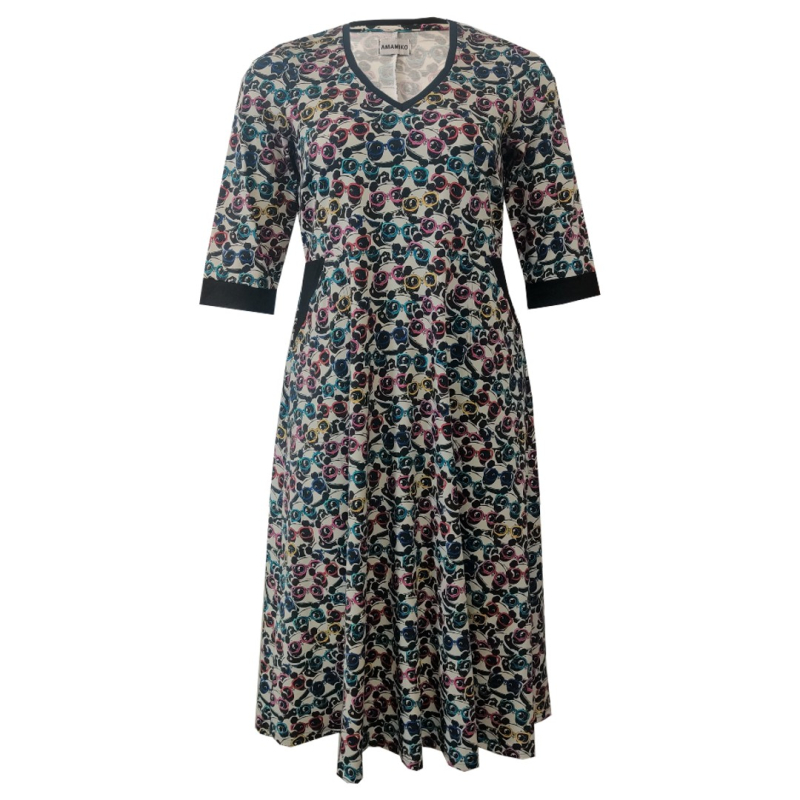 Dana er en midi kjole med empiresnit og v-hals. Her er kjolen syet i hvid oeko-tex bomuld jersey med søde pandaer med farverige briller. nbspLommer, ærmekanter og kanten ved halsen er sort. Kjolen går til ca. midt på læggen og har ærmer som slutter v