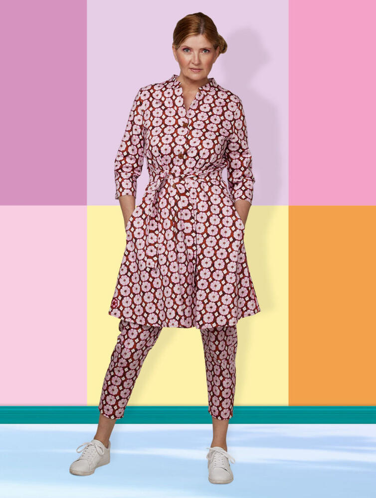 SmartkjoleiA-facontil kvinder fradu Milde. Kjolen harkinakrave,34 lange ærmer,lommer i siderne,bindebånd i taljenog ergennemknappet. Kjolen har et enkelt blomstret mønsterog enfin detaljei form af en strikket blomst, der er syet på forn