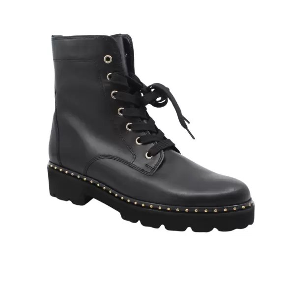 Art. No. 51. 751. 20Gabor Foulard 51. 751. 20 er elegante sorte støvler til damer, designet med et moderne twist. Disse læderstøvler har dekorative gulddetaljer langs sålekanten, der giver et stilfuldt look. Med snørebånd og lynlås på siden, sikrer de båd