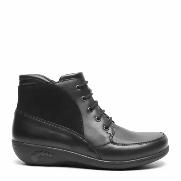 Art. No. 202-38-210Smart kortskaftet støvle til damer fra new feet. Støvlen er lavet med en flot overdel i glat kalveskind, sko har snørebånd og er på indvendige side udstyret med en lynlås der gør dem hurtig og nemme at få af og på. Støvlen er lavet med