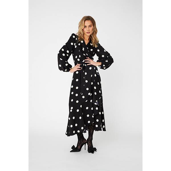 Elegant kjole med polkaprikmønster fra Crs Laracras-kjolen forener sofistikeret elegance med et livligt præg. Denne sorte, let draperede maxi-wrapkjole med store hvide polkaprikker udstråler tidløs charme, mens de dekorative flæsedetaljer langs sømmen t