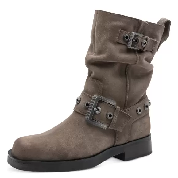 Art. No. 001-25472-45 341Disse stilfulde støvler fra Tamaris kombinerer et råt og feminint udtryk med høj komfort. Modellen er udført i blødt ruskind i en varm taupefarve, som giver et elegant, men afslappet look. De markante spænder og nitterdetaljer til