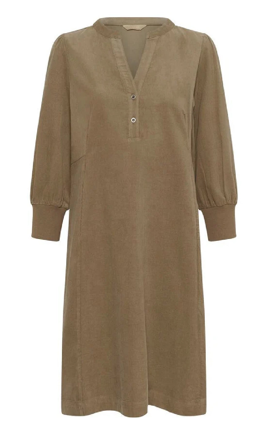 Kjole fra Culture Khakifarvet kjole fra Culture med V-udskæring, knapdetaljer og -ærmer med manchet – et enkelt og stilfuldt valg til hverdagsbrug.